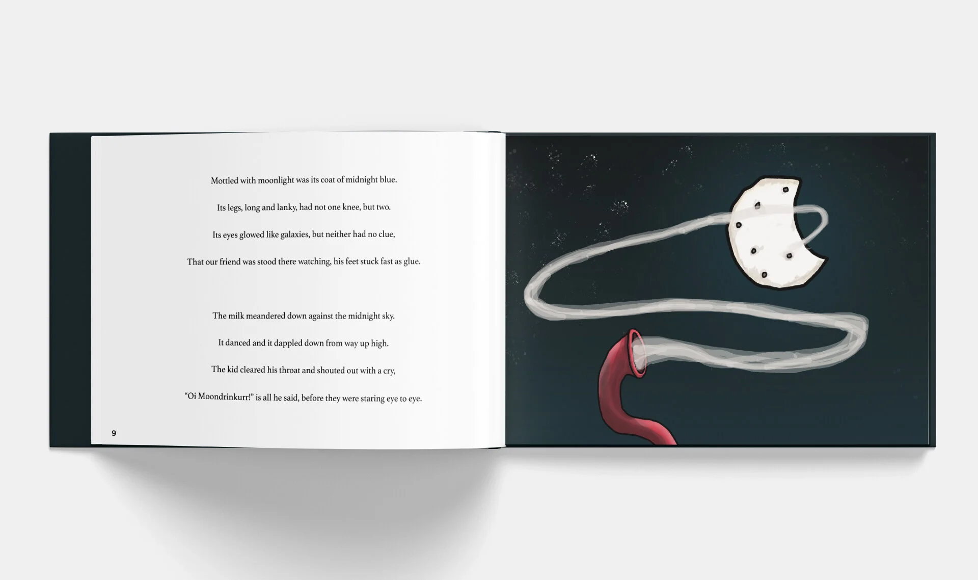 Through a poem, it tells the story of a boy who goes an adventure to find out what makes the moon change in size every month, only to discover a giant, cat-like creature drinking the moon’s milk…